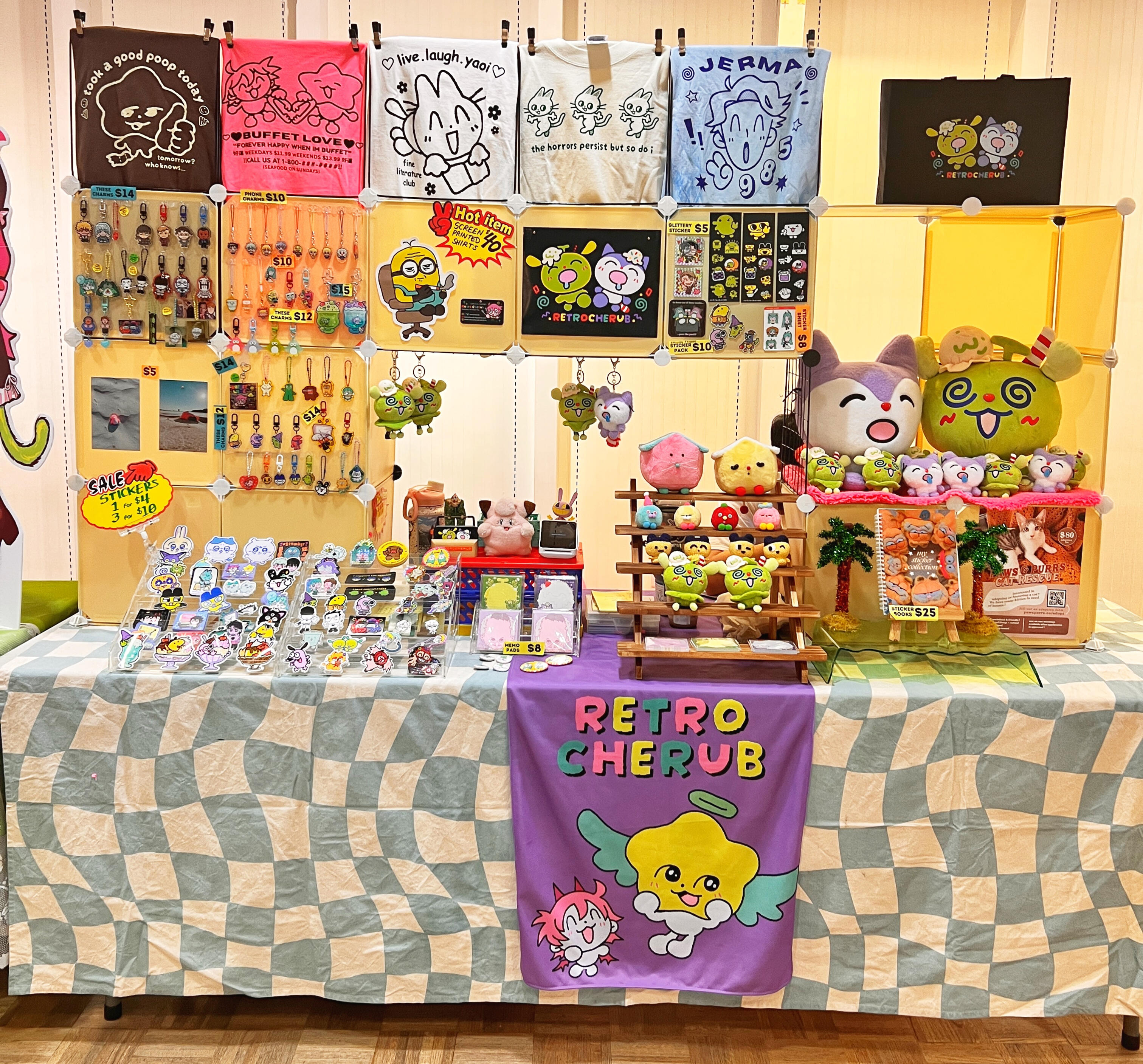 Click on images to make them biggerHi I'm Retro Cherub and I love funny and silly things! My fan and original art are inspired by dollar store toy graphics that are bright and silly. From at home screen printed shirts, stickers, original plush, charms, and stationery I hope you can find something silly!! :)original= my own original characters that I created and designed